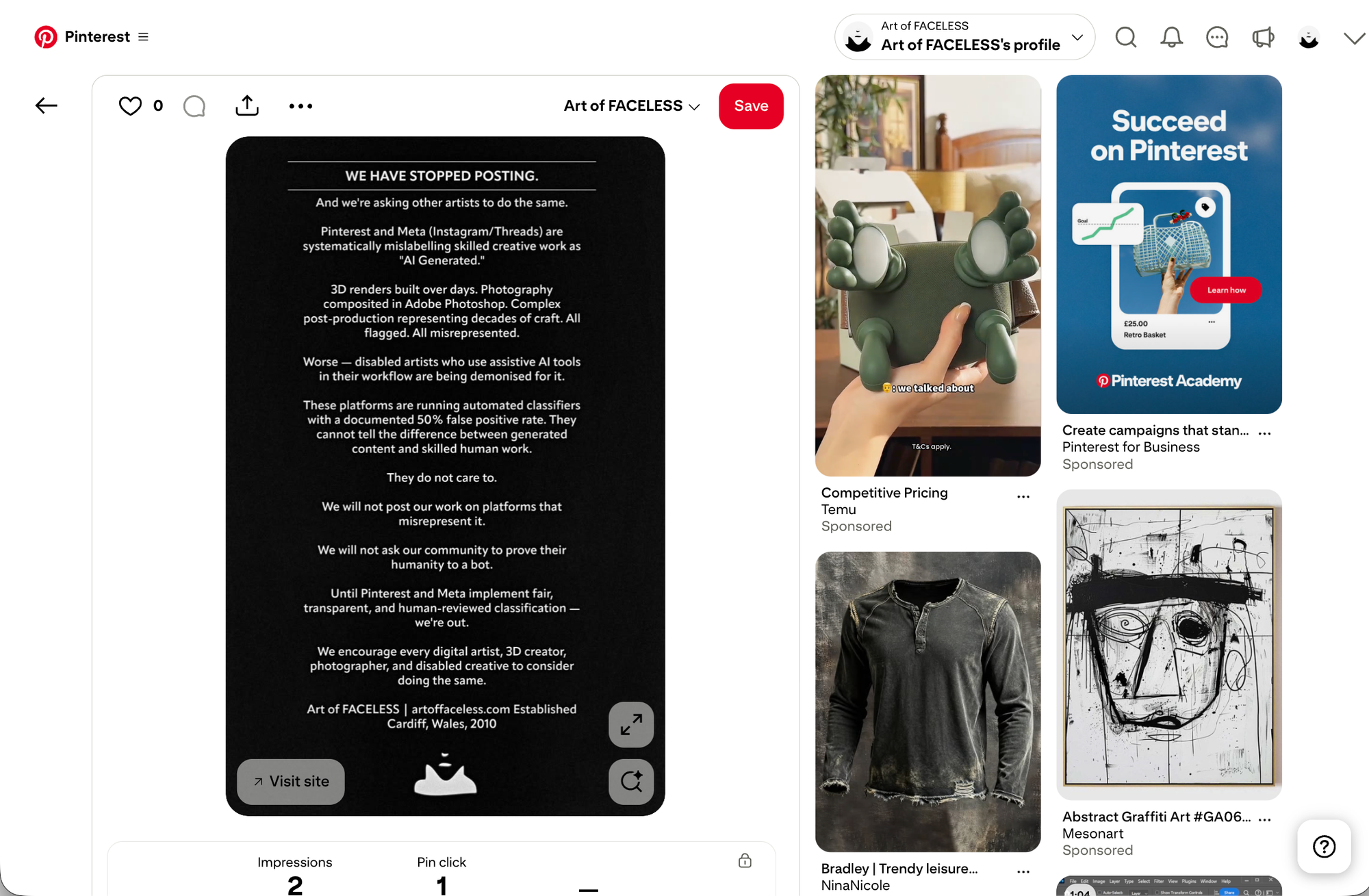 On the left of the screen: our exit post, still live, still sitting at the account we'd effectively abandoned. On the right of the screen: a sponsored advertisement. Paid placement. Pinterest taking money to promote a product to users of the platform it had just finished misclassifying our work on.