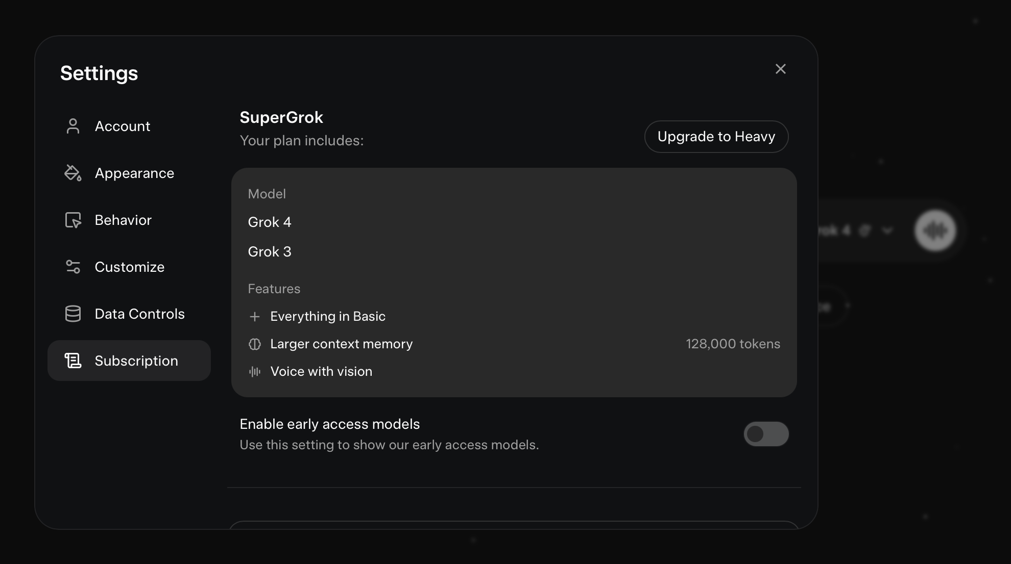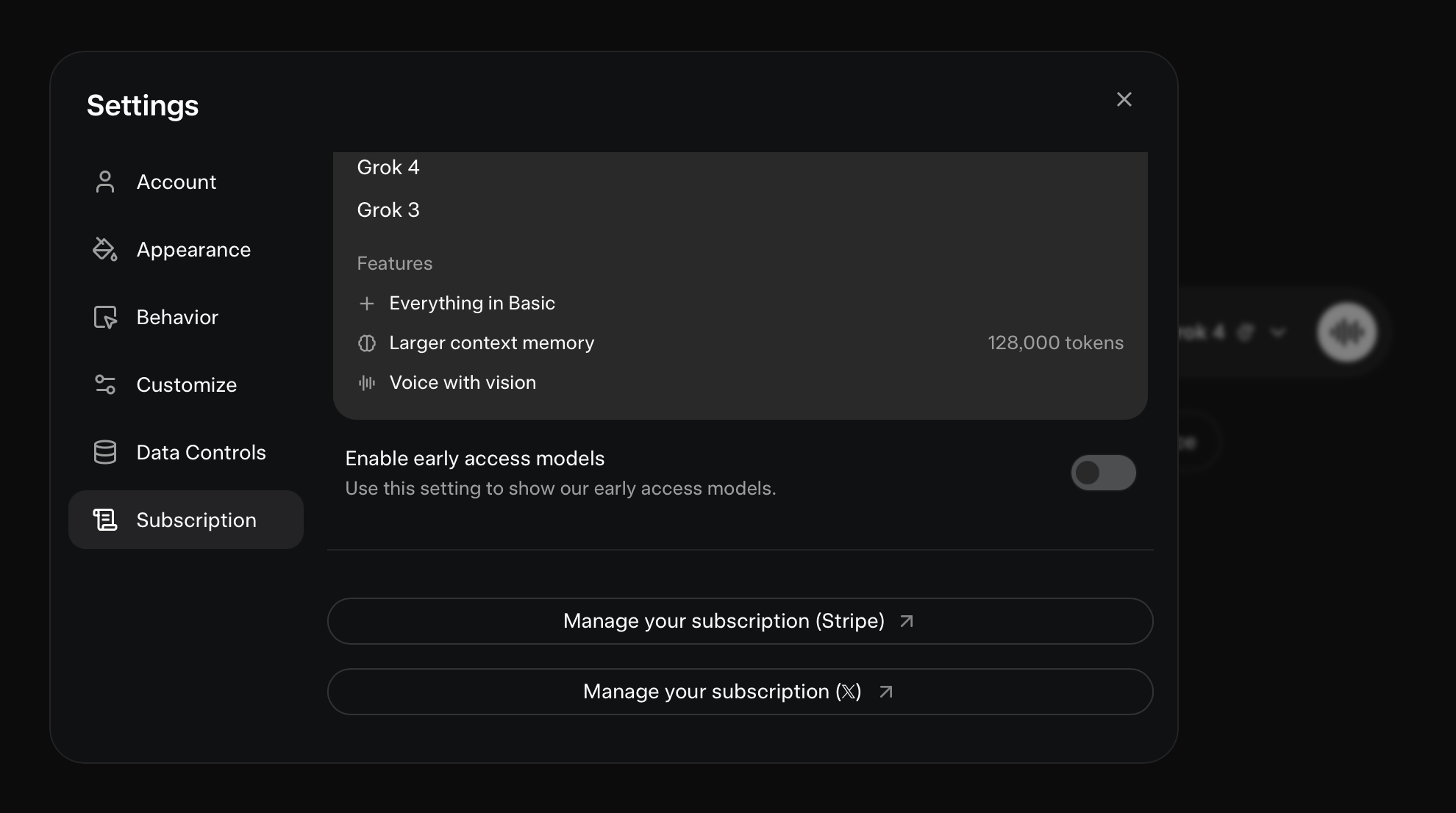 Image shows a dark-themed settings modal titled SuperGrok. The left sidebar inside the modal contains menu items: Account, Appearance, Behaviour, Customize, Data Controls, and a highlighted Subscription tab. The main panel displays the active plan including Grok 4 and Grok 3, plus added benefits such as larger context memory. The modal itself has no visible scroll bar or cancellation button, making subscription controls appear non-interactive. The underlying webpage behind the modal contains the actual billing management links, but these are off-screen unless the user scrolls the background. The interface relies on pop-ups from billing owners such as Stripe or X (formerly Twitter) for cancellation. The lower portion of the screen shows a toggle for "Enable early access models" and explanatory text, reinforcing the decoy nature of the modal.