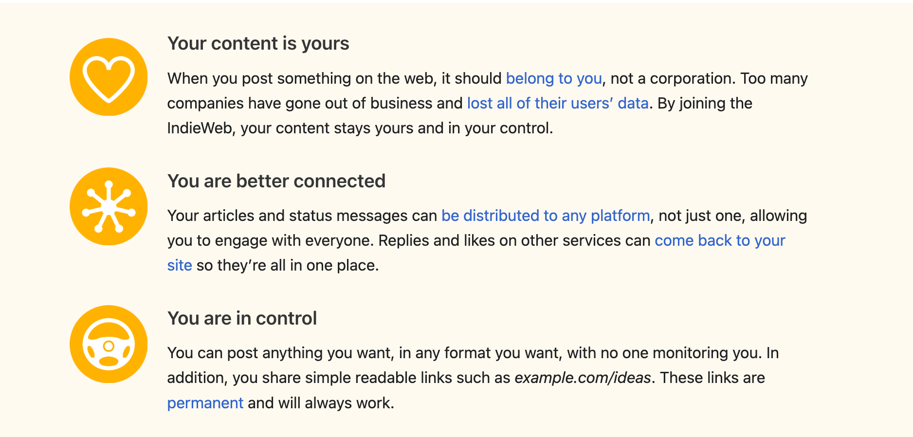 After I filed this piece, someone sent me a screengrab of IndieWeb's own principles page. Three promises, rendered in cheerful orange icons.