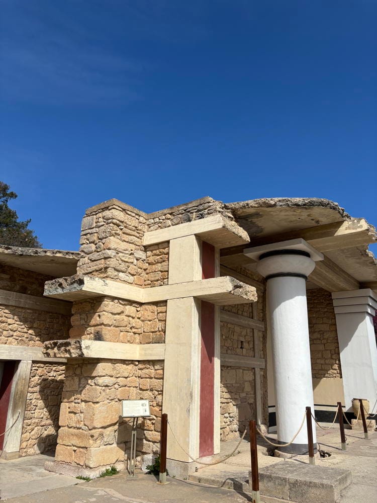 When we talk about who gets to name things, who gets to frame the story, whose resources allow them to make their interpretation structurally permanent — Knossos is not an abstract case study. It is a physical place you can walk through on a March afternoon, touching the concrete, watching the tourists photograph fresco reproductions painted by Swiss artists, standing inside the labyrinth that was never real.